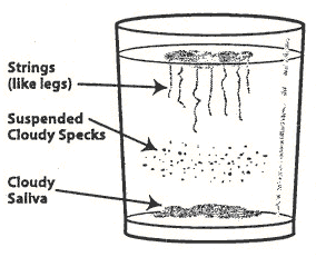 If you have candida overgrowth, it will show up in the saliva, a friendly environment for yeast. When you spit into the glass, the aerated saliva is lighter than water. However, candida is heavier than either. Whether it sinks as “legs”, falls to the bottom, or floats around in the water, all are indications of candida. The more you see, and the faster you see it, the more systemic the infection.
